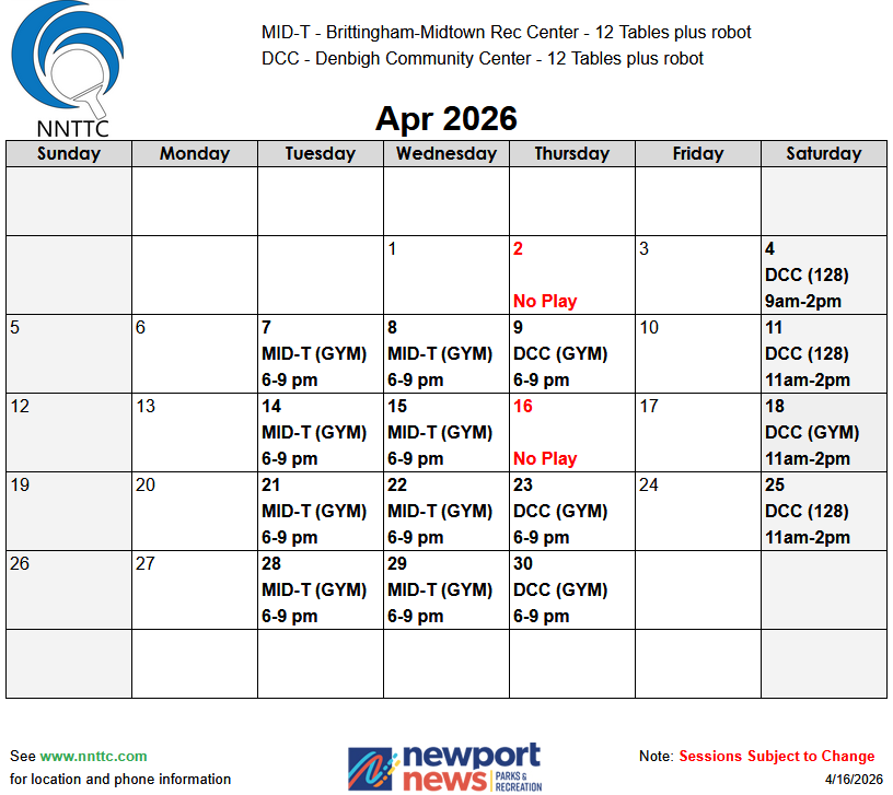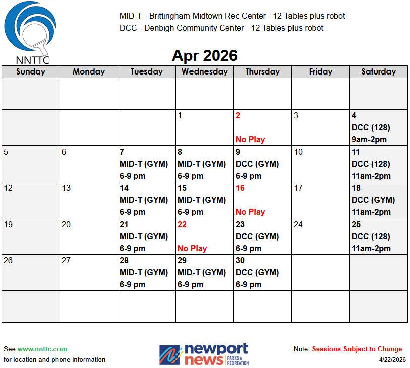 The Newport News Table Tennis Club (NNTTC) is a USATT affiliated table tennis club located in Newport News, VA. We have members of all skill levels and all ages.
